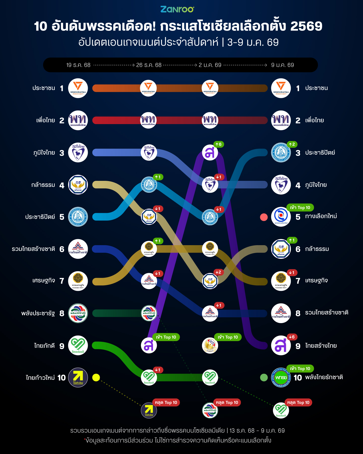 ข้อมูลข้างต้นรวบรวมจากยอดการมีส่วนร่วม (Engagement) ที่มีการกล่าวถึงชื่อพรรคบนโซเชียลมีเดีย ระหว่างวันที่ 13 ธันวาคม 2568 – 9 มกราคม 2569